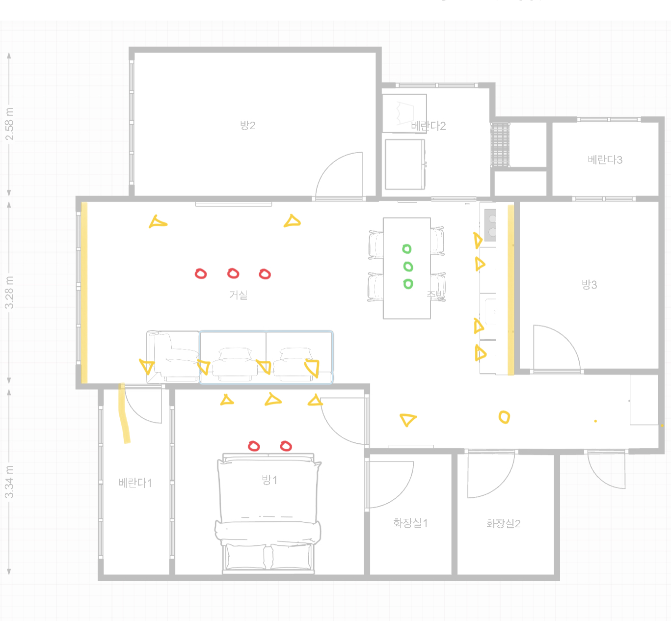 우리집의 조명은 아래와 같이 이렇게만 설치되어 있다. 물론 밝게 하고자 할때는 라인조명을 키면 온 집이 밝아질 수 있다.
